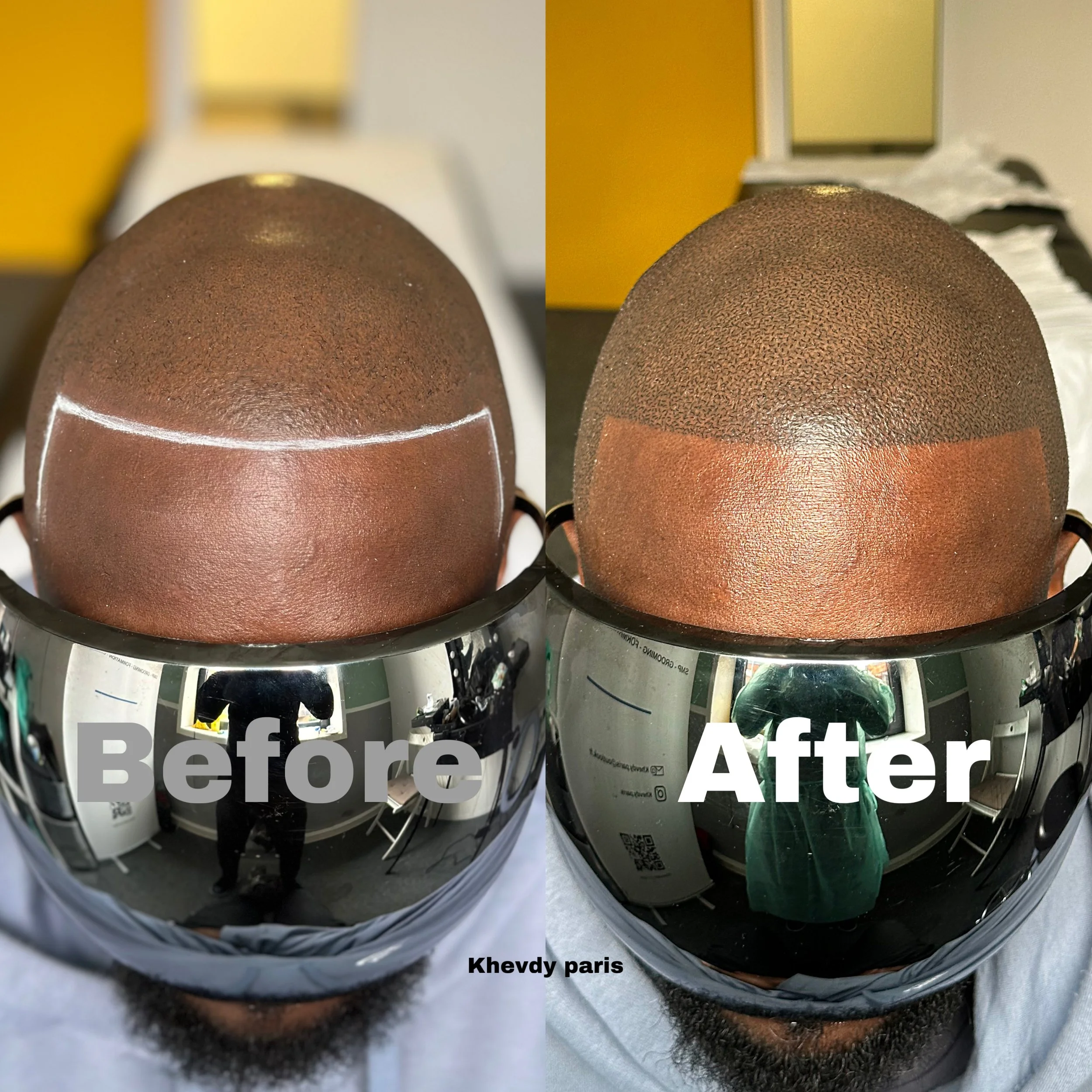 Avant / Après notre travail de tricopigmentation. Résultat léger et naturel effectué en dots uniquement