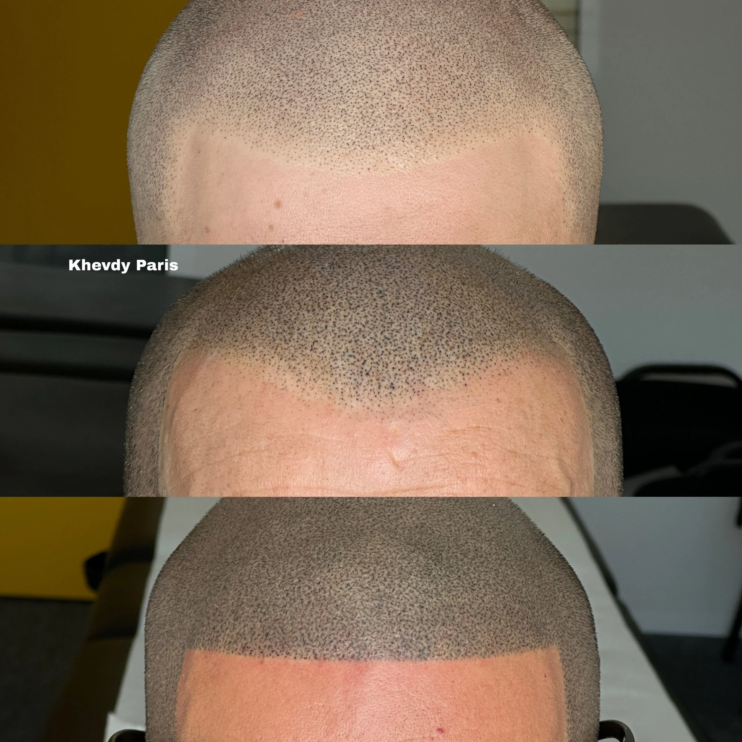 En bas : résultat cicatrisé après notre intervention en micropigmentation capillaire (SMP), réalisée pour corriger un ancien travail de tricopigmentation.