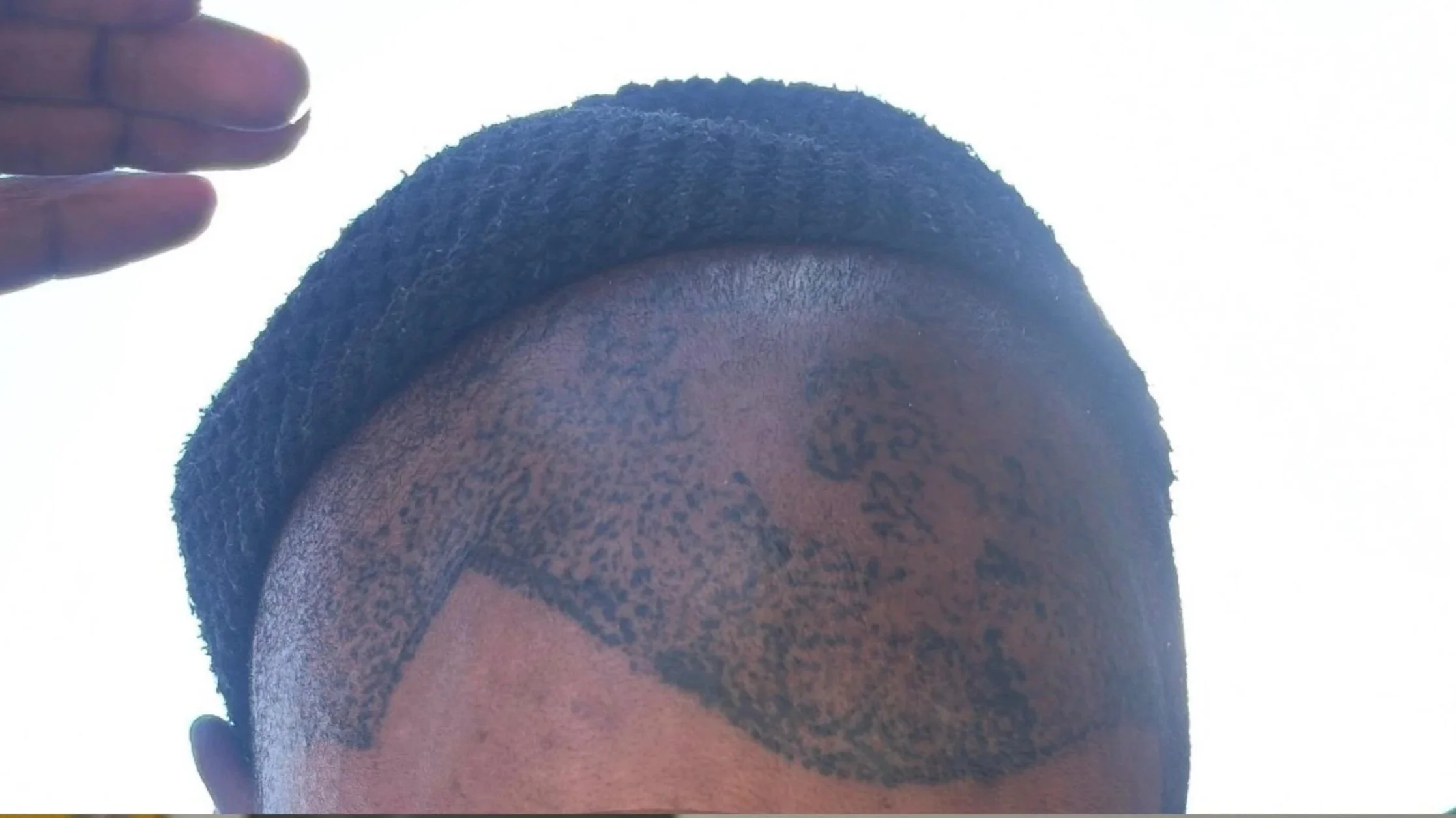 En haut : résultat cicatrisé après une intervention réalisée dans un salon de tatouage . Le client souhaitait une micropigmentation capillaire (SMP), mais la technique de tatouage classique utilisée avec de l’encre n’était pas adaptée aux exigences spécifiques de la SMP. Nous n’avions pas pu prendre en charge le cas de ce client.